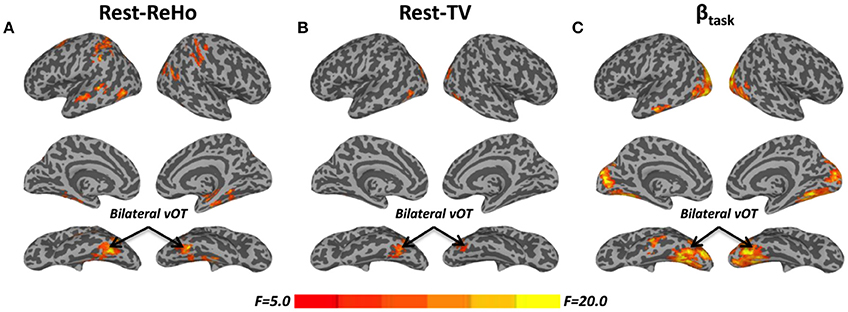 We found Rest-ReHo and Rest-TV had correlations in the vOT. That is, the higher the local signal synchronization the higher the temporal variability. Our observation echoes several recent studies on the relationship between the two using a biophysically based computational model (Wong and Wang, 2006; Deco et al., 2013; Yang et al., 2014). Their modeling results revealed that temporal variability increased as a function of increasing signal synchronization. Modeling results may serve as an initial proof-of-principle of temporal variability neural bases, as the model explicitly excludes non-neural signal sources (Yang et al., 2014). This is consistent with our current findings and recent fMRI studies, where Rest-ReHo and Rest-TV were highly correlated (Yuan et al., 2013; Huang et al., 2016).