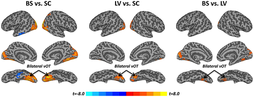 Task activation (βtask) was examined during a tactile pattern recognition task (see more details in Section Methods). Using one-way ANOVA, βtask showed significant group effect in wide-spread cortical regions; ventral and dorsal visual system, bilateral vOT, primary visual cortex, middle occipital cortex, and inferior temporal gyrus (Figure 1C and Table 2). With post-hoc t-test, evoked activity of SC to LV to BS reveals gradient increase except in the inferior temporal gyrus, where the BS showed lower activation compared to SC (Figure 3 and Table 2).