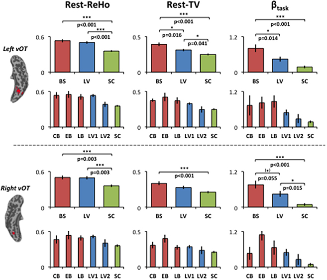Figure 4. Group contrasts of Rest-ReHo, Rest-TV, and βtask in the left and right vOT. Rest-ReHo, regional homogeneity; Rest-TV, temporal variability; βtask, task activation; BS, blind subjects; LV, low-vision subjects; SC, normally sighted controls; CB, congential blind subjects; EB, early blind subjects; LB, late blind subjects; LV1, level 1 low-vision subjects; LV2, level 2 low-vision subjects; vOT, ventral occipitotemporal cortex. *p < 0.05; (*) marginal significance. Error bars indicate ± 1 SEM. The bar-diagrams for CB, EB, LB, LV1, LV2 and SC were used for illustration purpose. No statistical analysis was performed among these groups due to limited number of subjects.