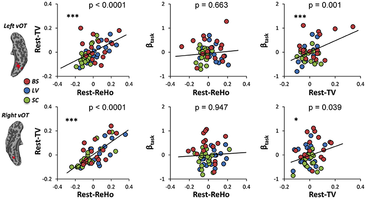 Figure 5. Links across Rest-ReHo, Rest-TV, and βtask. Scatter plots displaying inter-subject partial correlations acorss Rest-ReHo, Rest-TV, and βtask in the left and right vOT (n = 56). For illustration purpose, the values in the x- and y- axis are residuals of a pair of variables (e.g., Rest-TV and βtask) after regressing out the effect of the third variable (e.g., Rest-ReHo). ***p < 0.005; *p < 0.05.