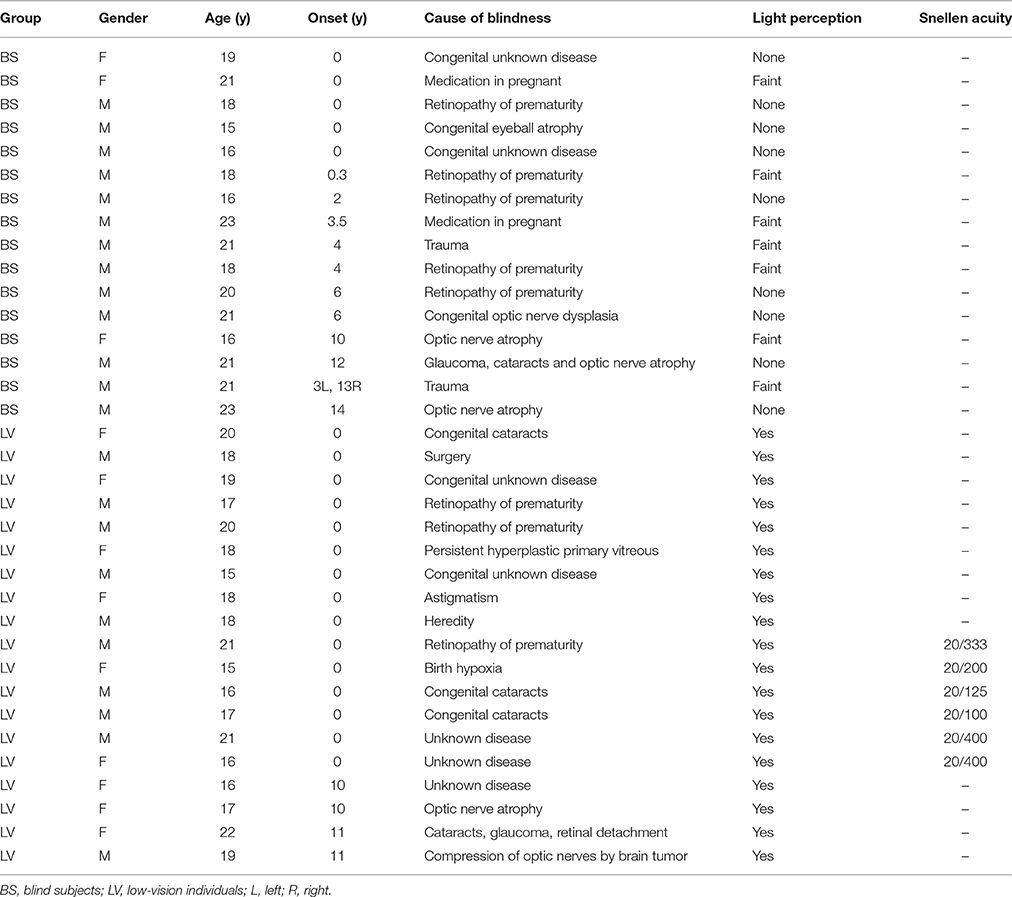We recruited visually impaired subjects from a school for the blind, including 16 BS (3 female; ages, 15–23) and 19 LV (9 female; ages, 15–22; see Table 1 for a full description of BS and LV). They were from 8th grade to 11th grade. Before they came to school, they had to pass several tests to ensure that they have normal intelligence. All of them studied braille at school. We also recruited 21 sighted controls (SC; 8 female; ages, 17–21), which are educationally matched with blind subjects. Between these groups, there was no significant difference in age (F = 1.47, p = 0.240) or gender (F = 1.60, p = 0.210) by one-way ANOVA. BS was further divided according to the age of onset of blindness (AOB) into congenital blindness (CB; n = 5; AOB: 0 years old), early blindness (EB; n = 7; AOB: 0~6 years old), and late blindness (LB; n = 4; AOB: >10 years old). Also, the LV was divided according to the visual acuity into two sub-groups, where 20/400 ~ 20/200 was defined as LV1 (level one; n = 15) and 20/200 ~ 20/100 was defined as LV2 (level two; n = 4). For the subjects, no history of psychiatric or neurological disorders was reported.