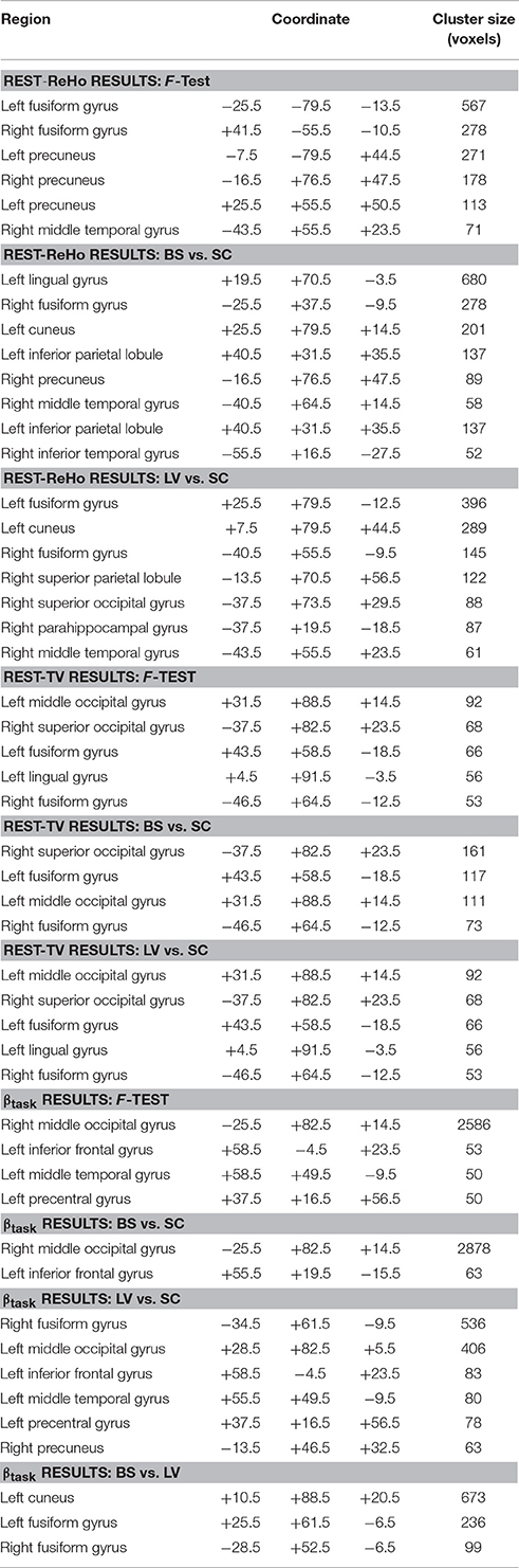 Whole brain one-way ANOVA was conducted to examine the group difference of Rest-ReHo, Rest-TV, and βtask. Post-hoc t-tests including BS vs. SC, LV vs. SC, and BS vs. LV were performed for each measure. Unless otherwise stated, the reported activations of this standard analysis were thresholded at corrected p < 0.05. Specifically, the threshold at voxel-level was P < 0.005 with the cluster size >50 voxels, using the first-nearest neighbor clustering (above threshold voxels cluster if faces touch). The voxel size was 3*3*3 mm3. The threshold at cluster-level was P < 0.05 corrected for multiple-comparison using Monte Carlo simulation.