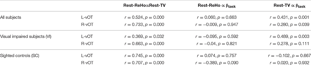 Considering that the task-related activation (βtask) in the vOT might be driven by different psychological factors (e.g., visual imagery) across BS, LV, and SC, we performed the correlation analyses separately for each of three groups (BS, LV, and SC). Unfortunately, no significant correlation between Rest-TV and βtask was found in either BS or LV. However, this might be due to the limited sample size of each group. Furthermore, we deem that BS and LV group were all visual impaired subjects and they were likely sharing similar neural mechanism than sighted control subjects. We thereby pooled BS and LV subjects together, namely visual impaired (VI) group (n = 35), and repeated partial correlation analyses again. Also, the same correlation analyses were applied to SC group (n = 21). We found that Rest-ReHo∝Rest-TV was significant in both VI and SC in the bilateral vOT. Rest-TV ∝ βtask was only significant in the VI in the left vOT, but not significant in other groups. This indicates that the correlations between Rest-ReHo∝Rest-TV and Rest-TV ∝βtask are fairly robust in VI. See details in Figure 6 and Table 3.