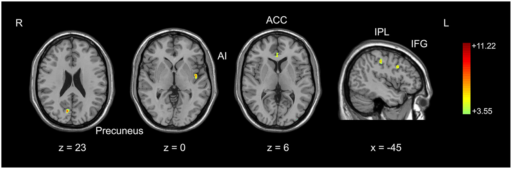 Comparison of gray matter volume between basketball players and novices. Cortical areas with more gray matter volume in basketball players compared to novices was shown. Color scale represents the significant t-values (corrected p < 0.05). L = left; R = right. Abbreviations for brain areas: ACC, anterior cingulate cortex; AI, anterior insula; IFG, inferior frontal gyrus; IPL, inferior parietal lobule.