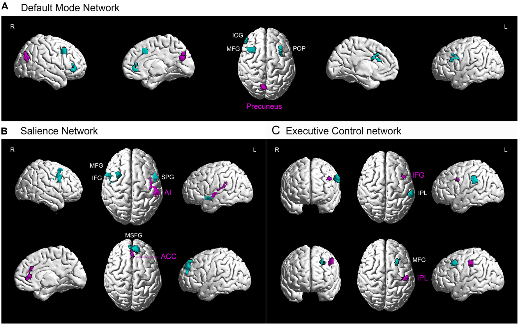 Higher resting-state functional connectivity in basketball players related to three cortical networks. Five seed regions (purple) with enhanced gray matter volume showed stronger functional connectivity with several brain areas (green) in the basketball players compared to novices. These functionally connected brain areas are parts of default mode network (A), executive control network (B) and attention network (C). L = left; R = right. Abbreviations for brain areas: ACC, anterior cingulate cortex; AI, anterior insula; IFG, inferior frontal gyrus; IOG, inferior orbitofrontal gyrus; IPL, inferior parietal lobule; MFG, middle frontal gyrus; MSFG, medial superior frontal gyrus; POP, pars opercularis (of the inferior frontal gyrus); STP, superior temporal pole.