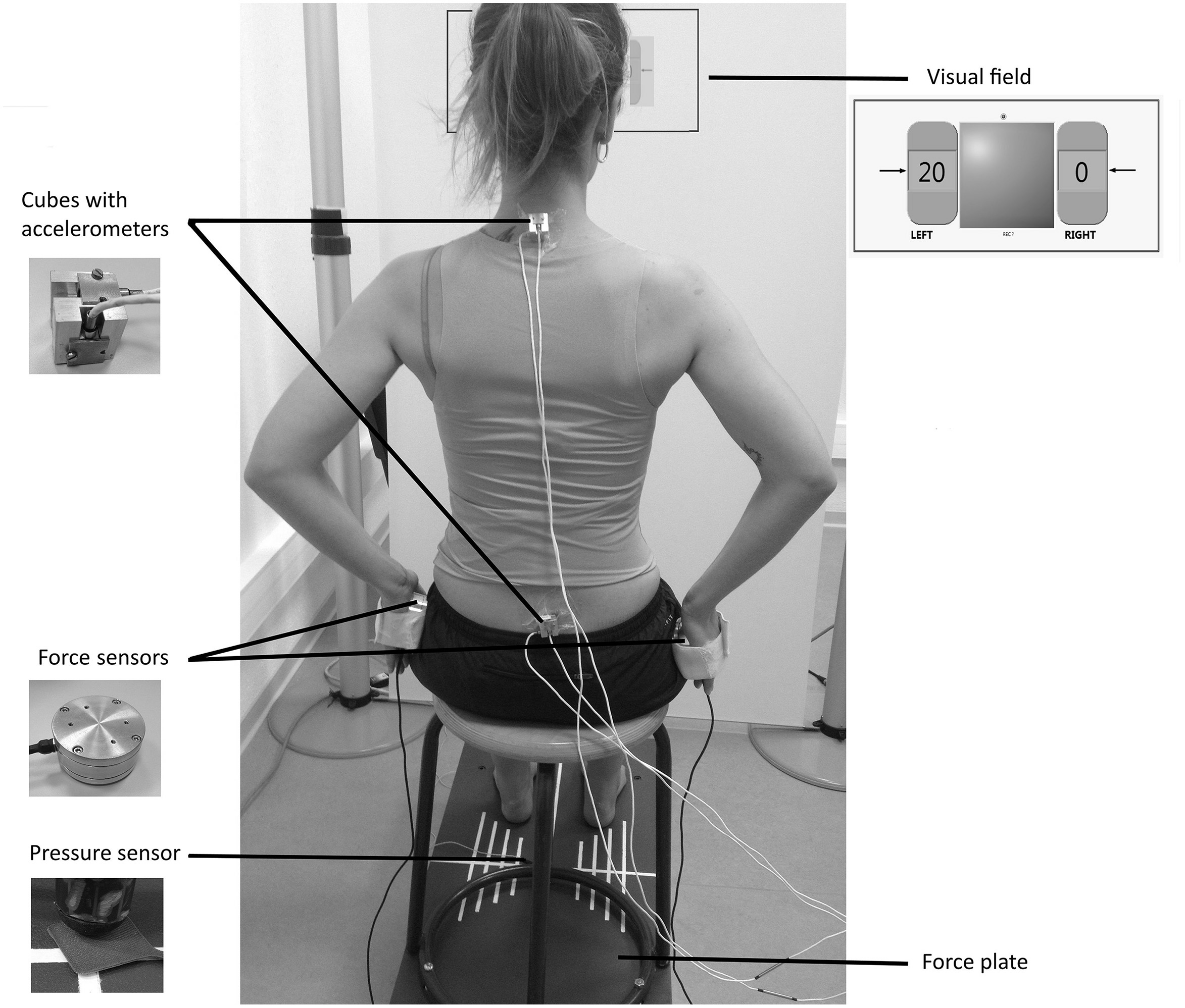 A stool (height = 48 cm; depth = 39 cm) with four legs and a round wooden top (diameter = 30 cm) was screwed on to the force plate and used for the experiments (Figure 1). To keep constant the friction forces between the stool top and the surface contact of the body, all participants wore the same kind of shorts.