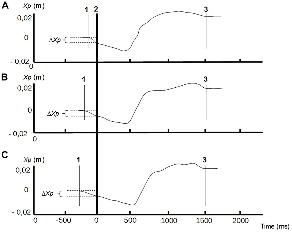 Center of pressure (CP) traces along the anterior-posterior axis (Xp) of a representative subject, in different conditions of bilateral compressive load: no compression (A) compressive load at 20% of the MVC (B), compressive load at 40% of the MVC (C). Line 1: CP onset; line 2: instant of « seat-off »; line 3: CP stabilization. Anticipatory postural adjustments (APAs) phase is between lines 1 and 2, and focal phase between lines 2 and 3. ΔXp represents the amplitude of the APAs.