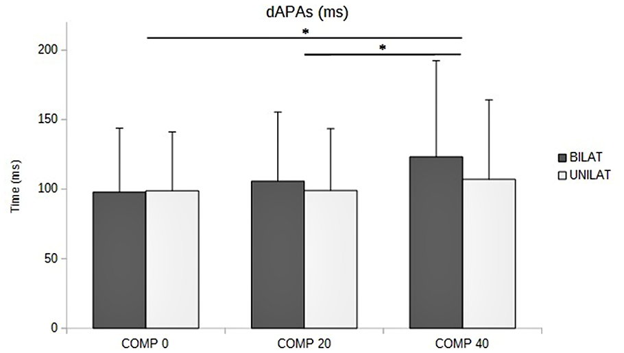 Duration of APAs (dAPAs, in ms) as a function of the compressive load: means and standard deviations (error bars) are presented in unilateral (UNILAT) and bilateral (BILAT) compressive load, at 0% (COMP 0), 20% (COMP 20) and 40% (COMP 40) of the MVC. *p < 0.05.