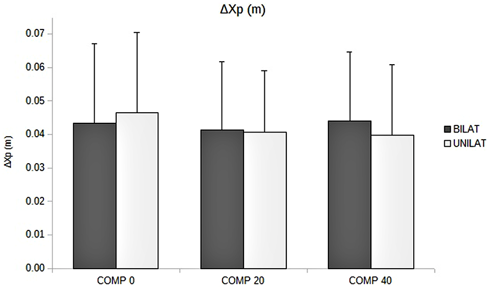 Amplitude of APAs (ΔXp, in m) as a function of the compressive load: means and standard deviations (error bars) are presented in unilateral (UNILAT) and bilateral (BILAT) compressive loads, at 0% (COMP 0), 20% (COMP 20) and 40% (COMP 40) of the MVC.
