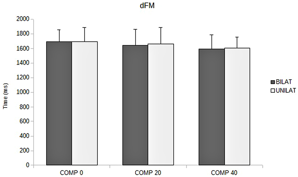 Duration of focal movement (dFM, in ms) as a function of the compressive load: means and standard deviations (error bars) are presented in unilateral (UNILAT) and bilateral (BILAT) compressive loads, at 0% (COMP 0), 20% (COMP 20) and 40% (COMP 40) of the MVC.