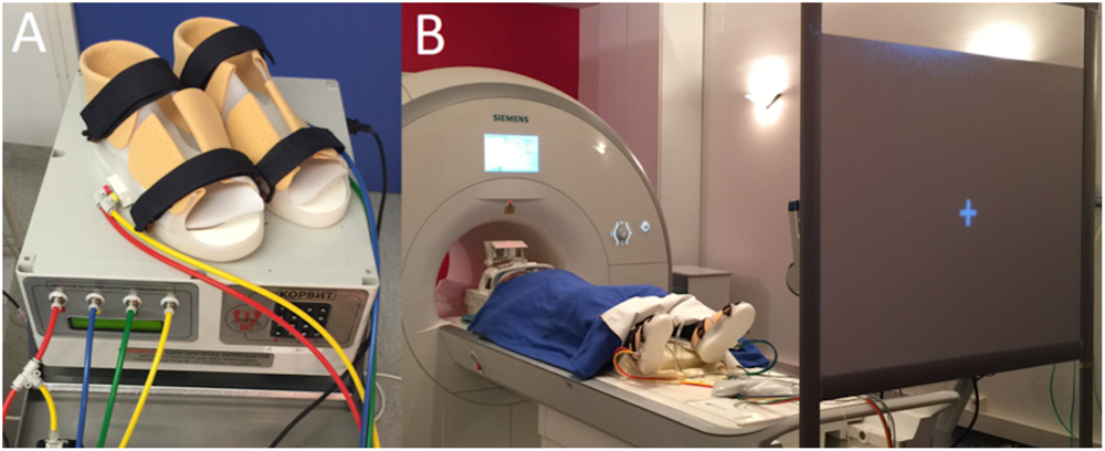 The MRI-compatible Korvit simulator (Figure 1) was used to mechanically stimulate the plantar support zones of the feet. The Korvit system consists of a pair of plastic boots connected to a compressor by air cables. Three sizes of boots are available. The inflatable rubber chambers were placed under the phalanges and the heel of each participant, and produced a pressure of 40 kPa on these zones. The Korvit simulator was first developed by IBMP (Moscow, Russia) for cosmonauts to simulate walking in space and to reduce neuromuscular impairment following prolonged weightlessness (Layne and Forth, 2008). The device is manufactured by the companies “VIT” (Saint-Petersburg, Russia) and “Center of Aviaspace medicine” (Moscow, Russia).
