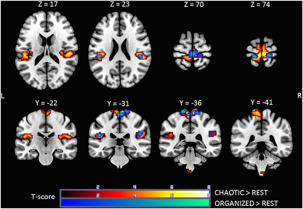 Statistical parametric maps for the CHAOTIC > REST (warm colors) and ORGANIZED > REST (cold colors) contrasts, p-value threshold of <0.05 FDR-corrected at voxel level with a minimum cluster extent of 10 contiguous voxels; images are presented according to neurological convention (R = right, L = left). See text for details.