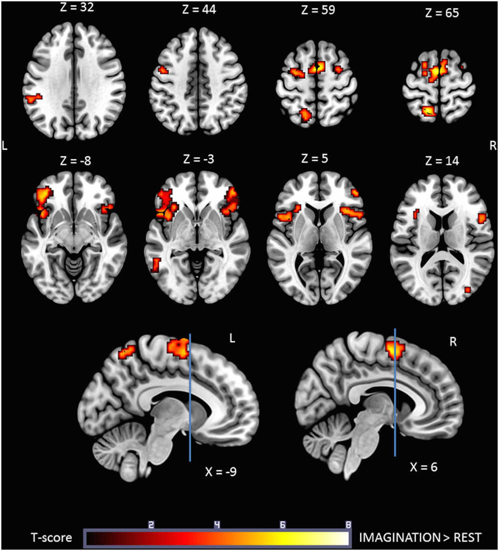 Statistical parametric map for the IMAGINATION > REST contrast p-value threshold of <0.05 FDR-corrected at voxel level with a minimum cluster extent of ten contiguous voxels; images are presented according to neurological convention (R = right, L = left). Blue lines in the sagittal images represent the vertical plane passing through the anterior commissure, separating pre-SMA (anteriorly) and SMA proper (posteriorly). See text for details.