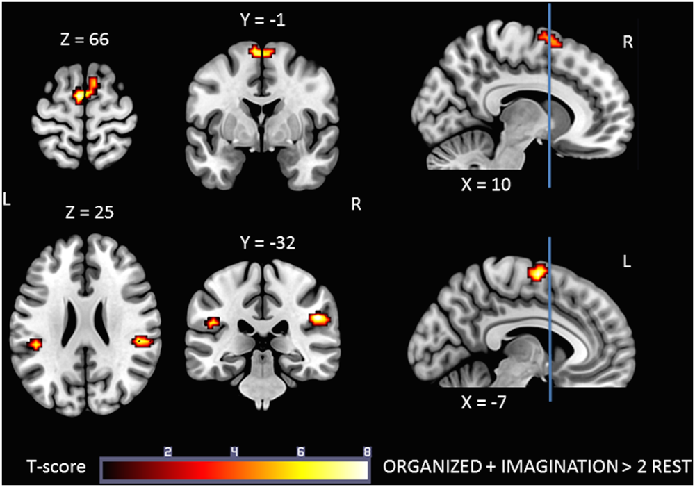 Each individual specific design matrix was filled with the following condition order: CHAOTIC, RESTChaotic, ORGANIZED, RESTOrganized, IMAGINATION, RESTImagination. To reduce artifacts from subject movements, the alignment rigid transformation parameters were also introduced as regressors. Thus, eight contrast images were computed with the following vectors :