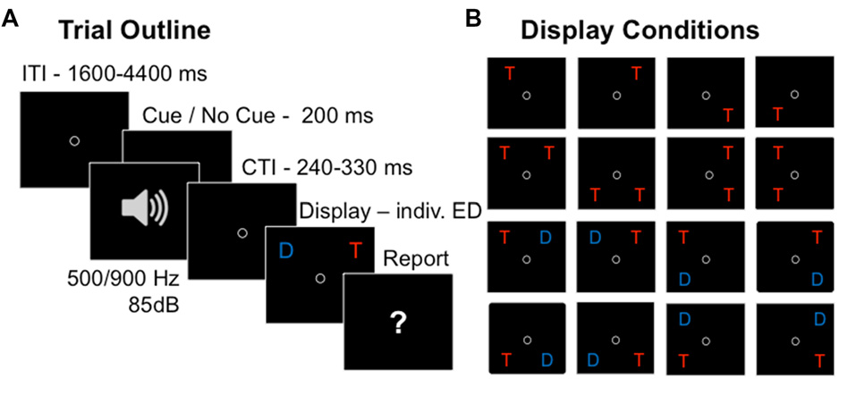 On each trial (Figure 1A), either a single target, two targets, or a target and a distracter were presented. Two letters were either presented vertically (ipsilateral display) or horizontally (contralateral display), but never diagonally, resulting in 16 different display conditions (Figure 1B). A trial started with a circle presented in the center of the screen, which participants were instructed to fixate throughout the whole trial. Then the letter array was presented on a gray background, with an individually adapted ED, which was determined in a pre-test prior to the experiment (see below). In random order and in 50% of the trials, the letter array was preceded by an auditory warning cue (a 85 dB tone presented equally often with a pitch of 500 Hz and 900 Hz, varying randomly to prevent habituation effects) played for 200 ms. Participants were told not to pay attention to the warning cue while performing the partial report task. Their task was to verbally report all the red target letters (i.e., up to two in the two-target conditions, and at most one in all other conditions), and to ignore the blue distracter letters when present. The report could be performed in any (arbitrary) order and without emphasis on response speed. Participants were instructed to report only those letters they had recognized “fairly certainly” and refrain from pure guessing. The experimenter entered the responses on the keyboard and pressed a button to initiate the next trial. In order to avoid response preparation (Vangkilde et al., 2012), the inter-trial intervals (ITIs) were drawn from a geometrical distribution with a constant hazard rate of 1/3 and a range of 1600–4400 ms using time-steps of 200 ms (Figure 1A). The cue-target intervals (CTIs) were uniformly distributed with a range of 240–330 ms using time-steps of 10 ms. In trials without cue, time intervals identical to the CTIs were added to the ITIs to keep timing constant over conditions.