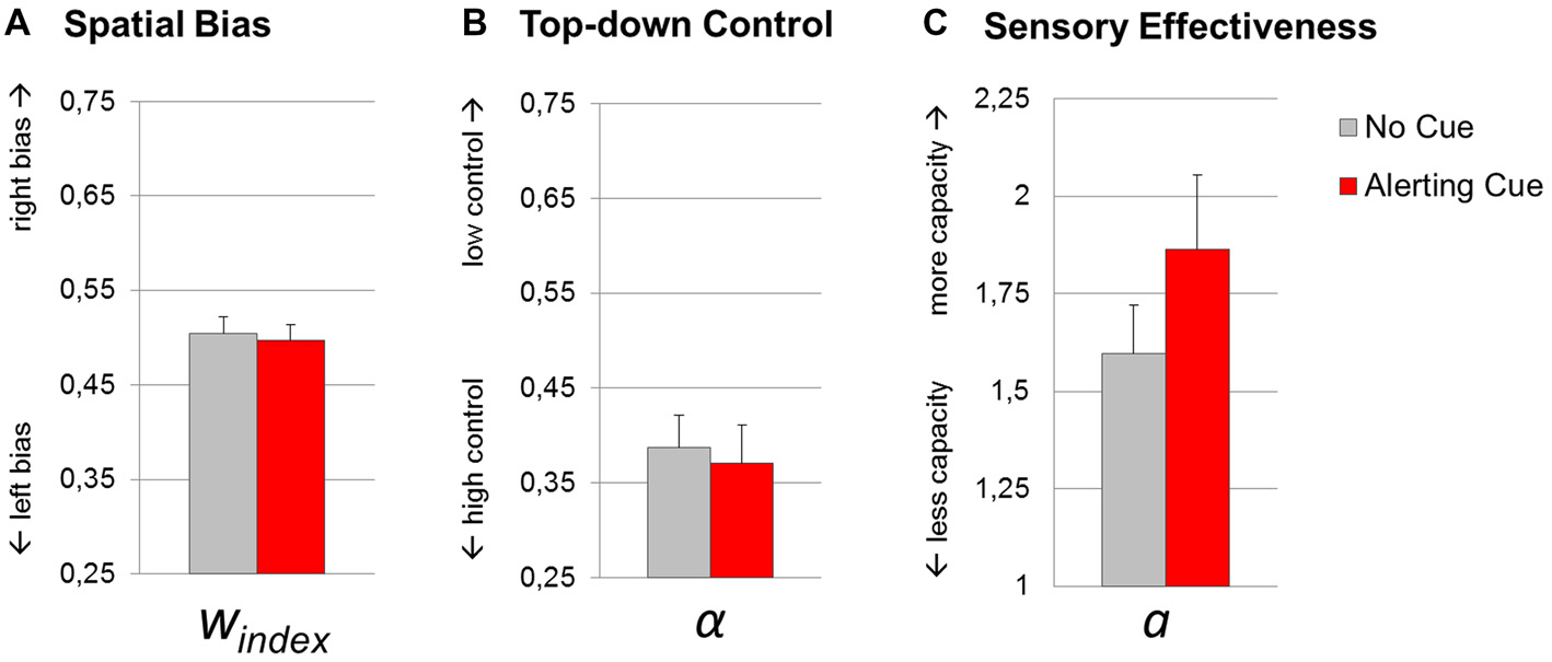 Theory of visual attention (TVA) parameter estimates resulting from fittings of trials with (red bars) and without (gray bars) an alerting cue. Group mean values of parameters spatial bias windex(A), top-down control α (B) and sensory effectiveness a(C). Error bars indicate standard errors of the mean.