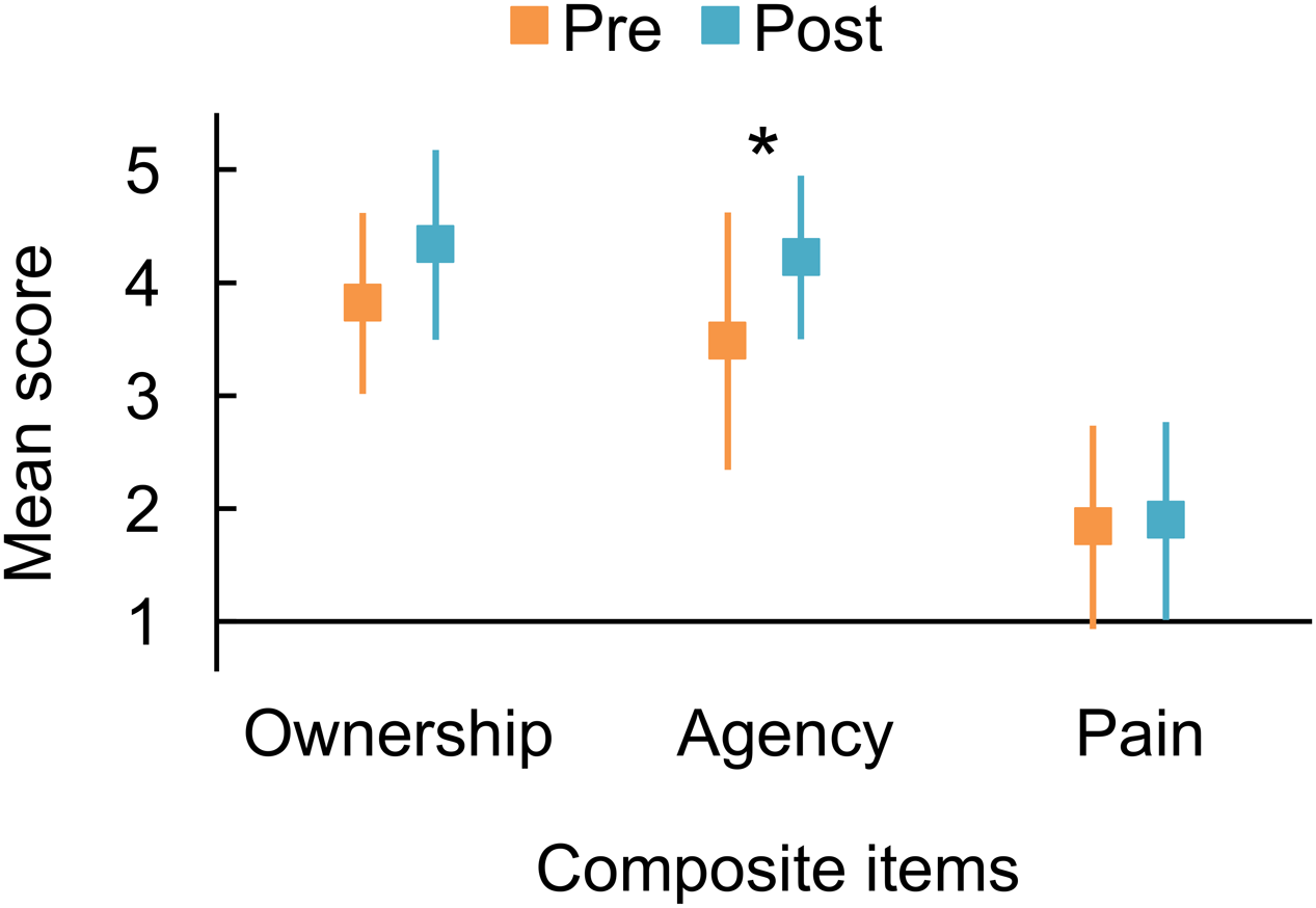 To begin with, we report the internal consistency of each composite variable of the phantom limb questionnaire. Before the trial, Cronbach’s alphas were 0.805 (Ownership), 0.944 (Agency), and 0.923 (Pain). Following the trial, alphas were 0.946 (Ownership), 0.880 (Agency), and 0.759 (Pain). Therefore, the internal consistencies of three composite variables were sufficient. We should note that the alpha for post-trial Pain was relatively low, perhaps due to the small number of items contributing to the formation of the composite variable (Tavakol and Dennick, 2011).