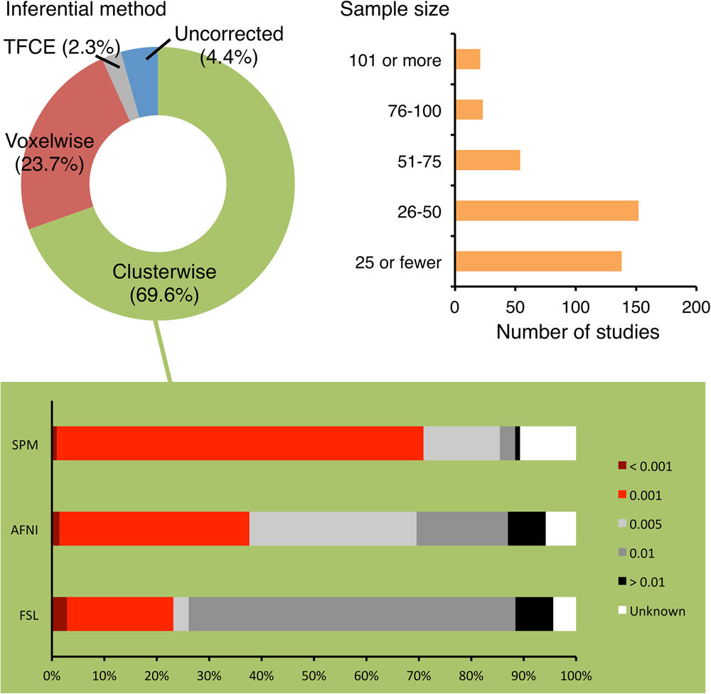 Results: The majority (95.6%) of the 388 analyzed articles reported statistics corrected for multiple comparisons. A large proportion (69.6%) of the 388 articles reported main results by clusterwise inference. The analyzed articles mostly used software Statistical Parametric Mapping (SPM), Analysis of Functional NeuroImages (AFNI), or FMRIB Software Library (FSL) to conduct statistical analysis. There were 70.9%, 37.6%, and 23.1% of SPM, AFNI, and FSL studies, respectively, that used a CDT of p ≤ 0.001. The statistical sample size across the articles ranged between 7 and 1,299 with a median of 33. Sample size did not significantly correlate with the level of statistical threshold.