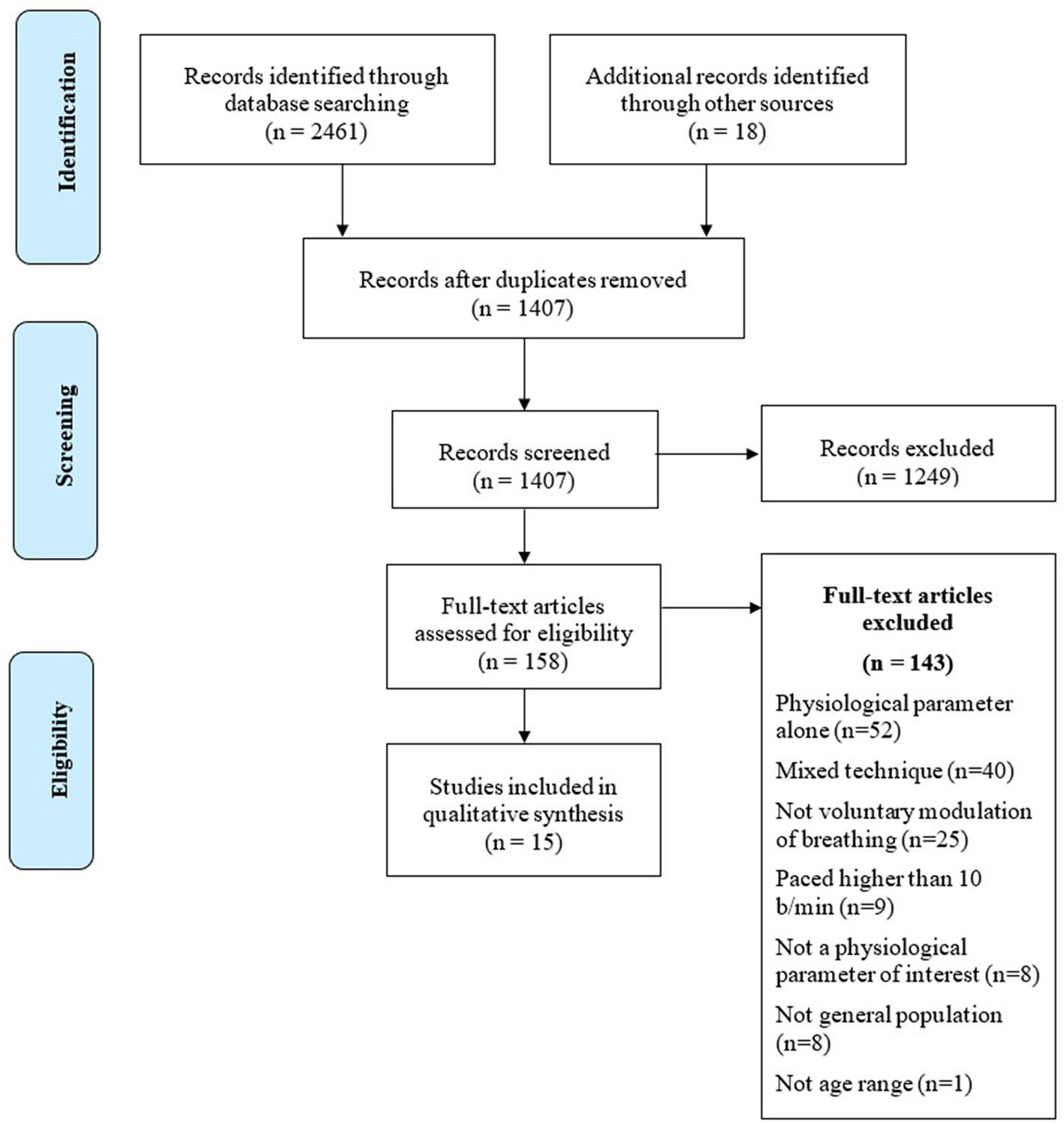 Methods: A systematic search of MEDLINE and SCOPUS databases, using keywords related to both breathing techniques and to their psychophysiological outcomes, focusing on cardio-respiratory and central nervous system, has been conducted. From a pool of 2,461 abstracts only 15 articles met eligibility criteria and were included in the review. The present systematic review follows the Preferred Reporting Items for Systematic Reviews and Meta-Analyses (PRISMA) guidelines.