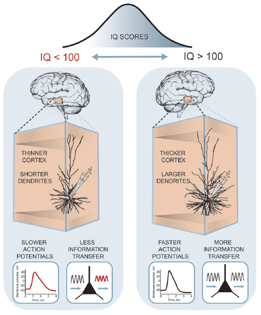 Figure 3. A cellular basis of human intelligence. Higher IQ scores associate with larger dendrites, faster action potentials during neuronal activity and more efficient information tracking in pyramidal neurons of temporal cortex. The figure is based on the results from Goriounova et al. (2018).