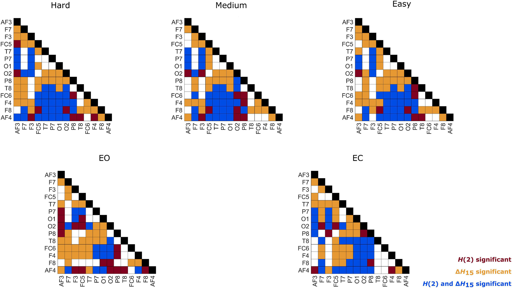 The Friedman tests indicated a significant effect of state (p < 0.01), and post hoc pairwise comparisons revealed that the rest states (EC, EO) were characterized by lower compared to the task states (Easy, Medium, Hard) (Figures 3, 4). Additionally, we found higher during EO compared to EC, for both H(2) and ΔH15 networks. A similar motif emerged in the local level comparisons, with the D of several nodes being significantly different between the rest and task states, as well as between EC and EO for both networks (Figure 5).