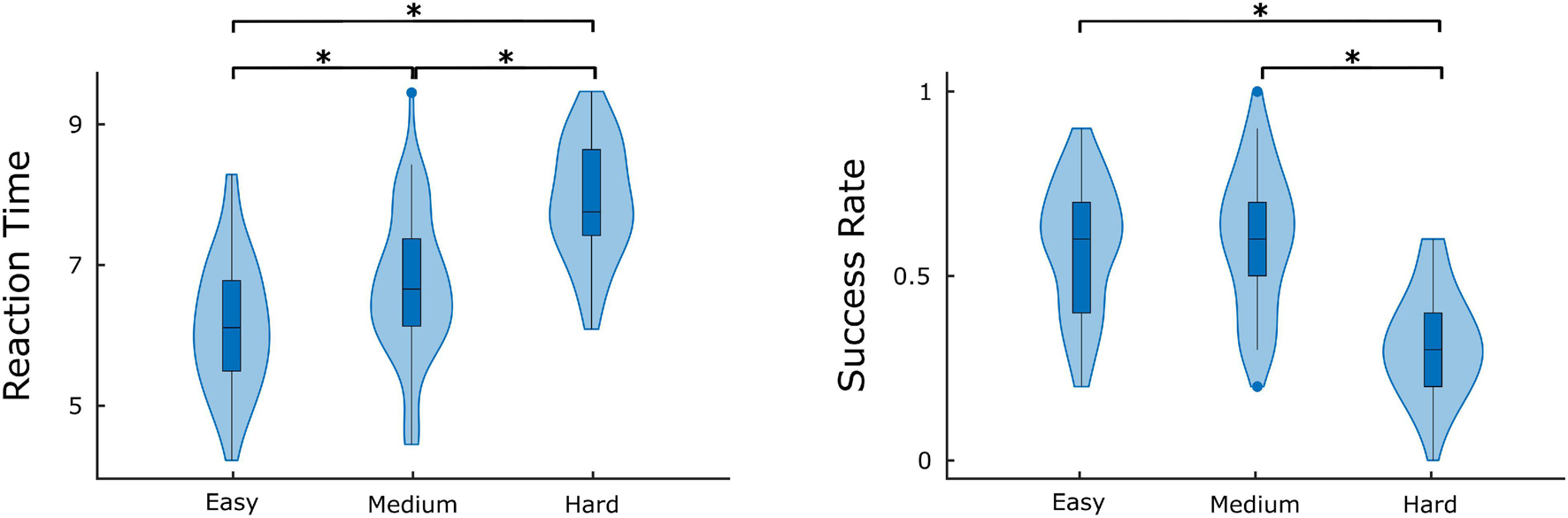 Figure 7. Average success rate and reaction time for different difficulty levels. Significant differences are marked by asterisk (*). Figure was created using Gramm (Morel, 2018).