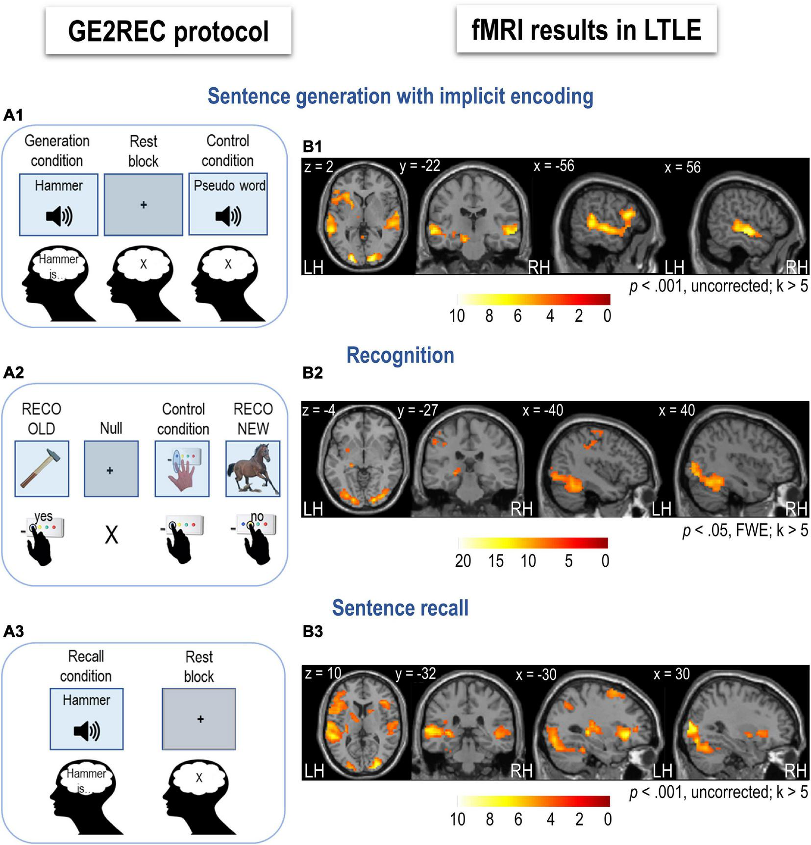 Apart from eliciting interaction between language and declarative memory, a presurgical fMRI protocol would have to allow to map the structures that are of importance for these functions, but also those that are of importance for TLE patients – temporal lobe and hippocampus (Binder et al., 2011; Benjamin et al., 2017; Buck and Sidhu, 2020). For this diagnostic purpose, an fMRI protocol should provide information regarding the dominant hemisphere and localization of the language-and-memory network (LMN) in relation to the potential epileptogenic zone (Ghosh et al., 2010). In doing so, it should be acknowledged that language and declarative memory interaction is based on a widely distributed network (Roger et al., 2020a). A presurgical protocol is additionally required to be applicable in the clinical setting that is quite different from the experimental environment. A protocol appropriate for a clinical setting should be short, easy to perform, and easy to analyze (Cabrera et al., 2018). Moreover, in presurgical evaluation, the level of interest is an individual patient, and studies on fMRI protocols usually report only group-level results (Deblaere et al., 2002; Aldenkamp et al., 2003; Buck et al., 2020; except Binder et al., 2011; Benjamin et al., 2017). However, it was shown that group-level effects are not always relevant or valid on the individual subject level (Seghier and Price, 2016). Therefore, a presurgical protocol needs to demonstrate the ability to activate the main network and critical regions on an individual level. This is especially important for structures, such as the hippocampus, susceptible to geometric distortions, signal loss, and low signal-to-noise ratio (Powell and Duncan, 2005; Haag and Bonelli, 2013; Buck et al., 2020). Finally, the results of an fMRI protocol should be integrated within a wider set of presurgical evaluations, above all neuropsychological scores, to interpret and comprehend a complex clinical image of a patient.