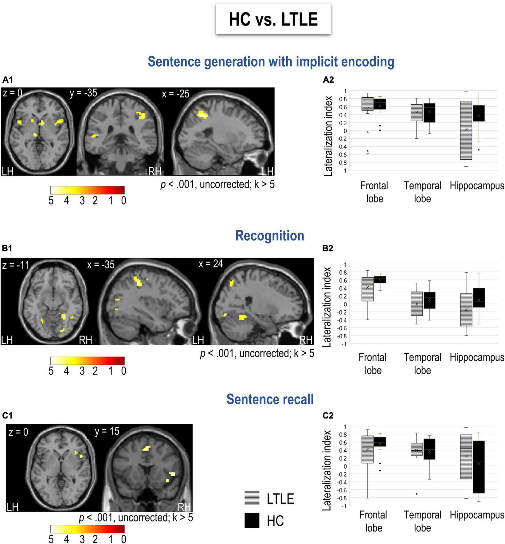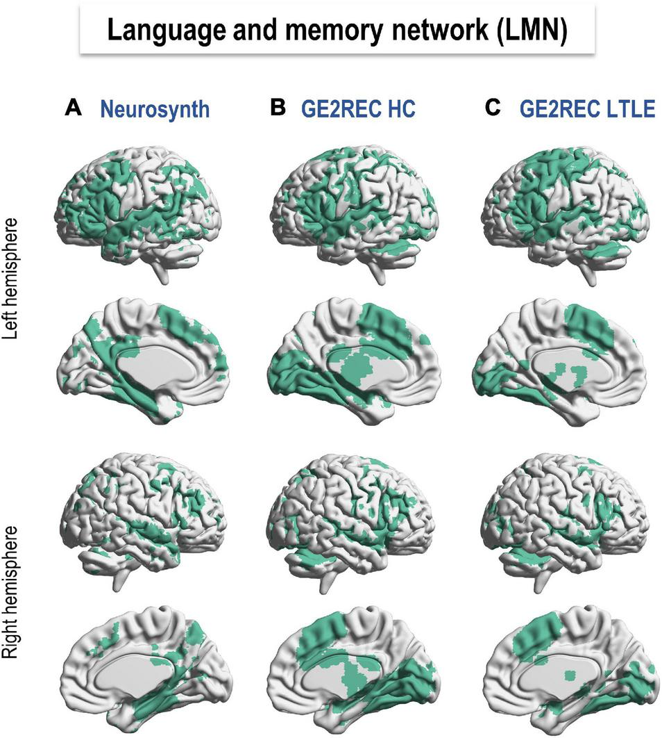 In the present study, we assessed the utility of the GE2REC fMRI protocol for mapping a LMN as a cerebral substrate of interaction between language and declarative memory in LTLE. The main objective is twofold: (a) to determine if this protocol is sensitive to differences between LTLE patients and healthy controls (HC), thus investigating neuroplasticity from a more fundamental and theoretical perspective; and (b) to provide some initial paths, currently only preliminary, of the potential benefit while adding the LMN information at an individual level during the neurosurgical planning (resection guidance) and of the cognitive mapping in this context. Finally, we will present two case studies to illustrate the application of the GE2REC protocol at an individual level before and after surgery. This also allowed us to explore the effectiveness of functional-anatomical reorganization.
