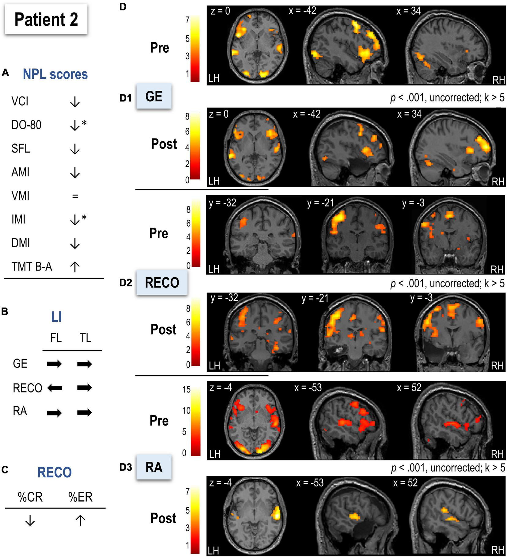 Arrows for neuropsychological and language assessment, recognition performance and LIs indicate the direction of change (increase, decrease, shift to left or right) after surgery. Neuropsychological and language changes marked with * indicate a significant score change (using 90% confidence interval). Scores marked in bold were pathological. LIs marked with * indicate significantly different values (p < 0.05) compared to healthy controls, based on modified Crawford test (Crawford and Garthwaite, 2002). LI values in bold indicate right hemispheric predominance (Seghier, 2019).