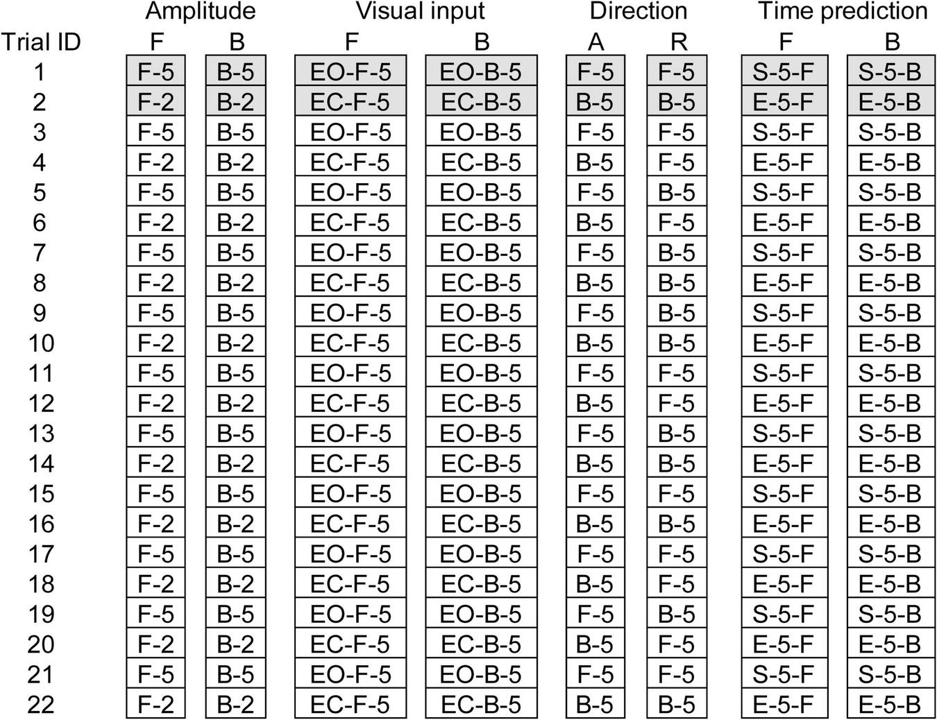 Schedule of eight trial blocks in experiment 2. Filled cells represent trials excluded from the data analysis. A, Alternative direction; R, random direction; F, forward translation; B, backward translation; EO, eyes opened; EC, eyes closed; 2, 2 cm amplitude; 5, 5 cm amplitude.