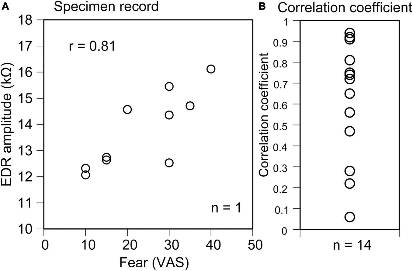 Scatter plot of the EDR amplitude as the function of the VAS indicating fear in a participant (A) and plot of the correlation coefficient between the EDR amplitude and VAS indicating fear across the participants (B).