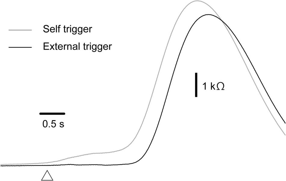 The EDR was successfully induced by the translation of the support surface in all trials across the participants. The onset latency of the EDR was approximately 1.5 s except for the trials with the self-triggered translation (Tables 3–6). In the Experiment 1, the externally triggered forward translation with a 5 cm amplitude was given. To compare the EDR in the Experiment 2 with that in the Experiment 1, the EDRs induced by the perturbation same parameters as the Experiment 1 (externally triggered forward translation with a 5 cm amplitude) were averaged across the trial blocks in the Experiment 2. Supposedly, the onset latency of the EDR must have been similar between the experiments, because of the same perturbation parameters between those. In spite of this supposition, the onset latency of the EDR in Experiment 2 was significantly longer than that in Experiment 1 (p = 0.048, unpaired t-test).