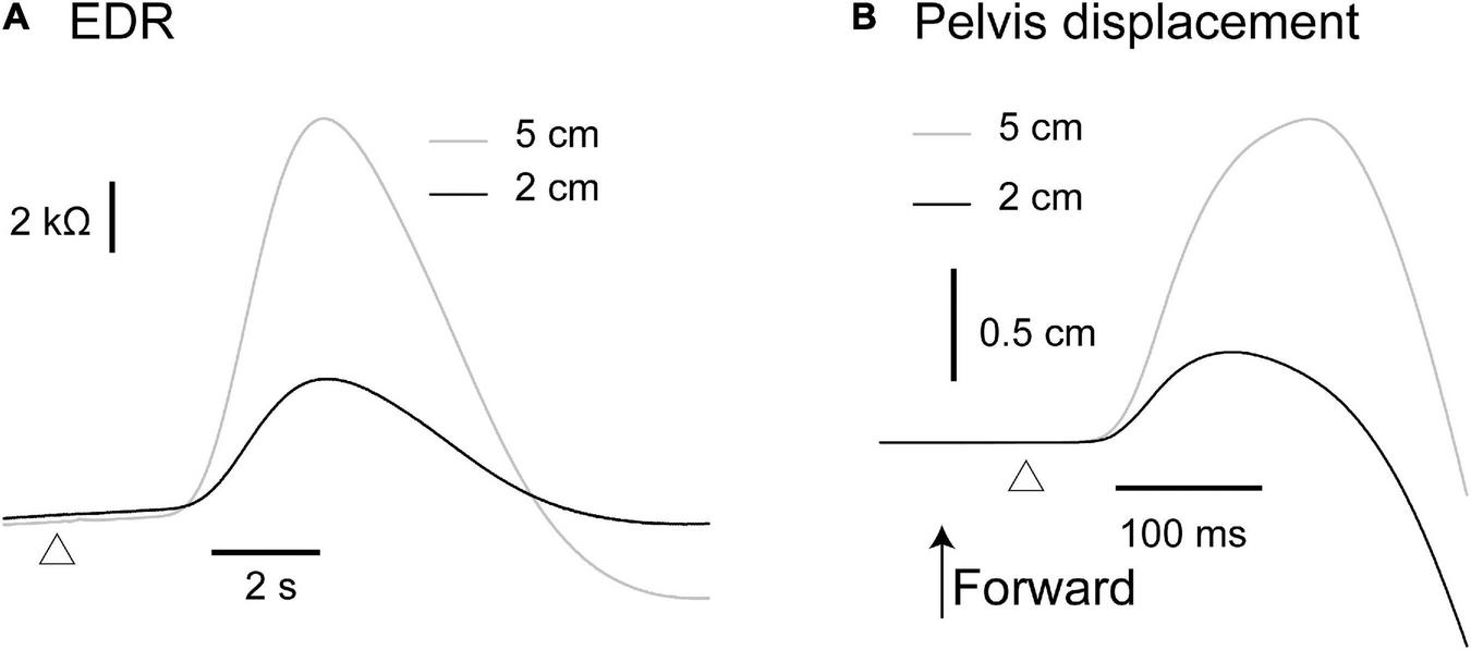 Previous findings have shown that some mental responses induced by the perturbation in stance are task-dependently modulated. For example, perturbation-induced EDR in sitting was dependent on the velocity of the perturbation (Sibley et al., 2010a). The latency of the muscle response in the tibialis anterior muscle induced by the backward perturbation (i.e., forward translation of the support surface) in stance was shortened by startling auditory stimulus but that induced by the forward perturbation (i.e., backward translation of the support surface) was not (Nonnekes et al., 2013). The effect of the attention was present on the postural response to the forward translation of the support surface, but it was absent for the backward translation of the support surface (Kunimura et al., 2019a,b). Accordingly, we speculate that the perturbation-induced mental responses, represented by the EDR, are task-specific (Hypothesis 4). To prove this hypothesis, we investigated whether perturbation-induced EDR was dependent on the size or direction of the perturbation.