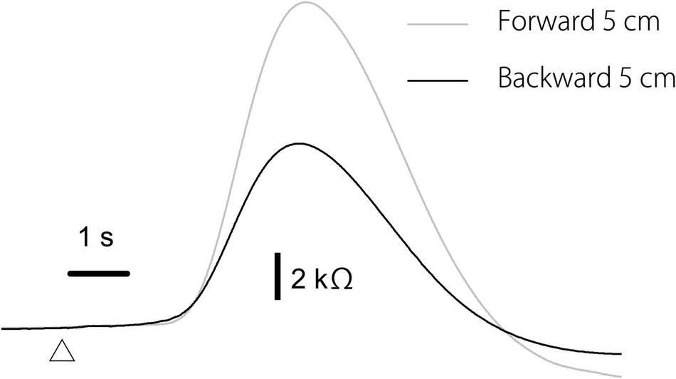 Unit: EDR amplitude (kΩ); EDR latency (s); Pelvis displacement amplitude (cm); Pelvis displacement latency (ms); *p < 0.05 (5 cm vs. 2 cm), Mean (standard error of mean).