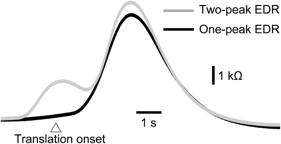Indeed, previous studies found that perturbation induces EDR in stance as well as in sitting (Sibley et al., 2008, 2009, 2010b). EDR represents multiple mental responses such as the perception of sensation or preparation for action (Khalfa et al., 2002; Dawson et al., 2011; Boucsein, 2012). Perturbation in stance likely induces multiple mental responses such as change in arousal, attention, or expectancy of the perturbation as well as the perception of sensory input, motor response, or perturbation-induced fear of fall (Sibley et al., 2014). Based on this view, EDR induced by the perturbation in stance may sometimes be comprised of multiple peaks representing those multiple mental responses (Hypothesis 1).