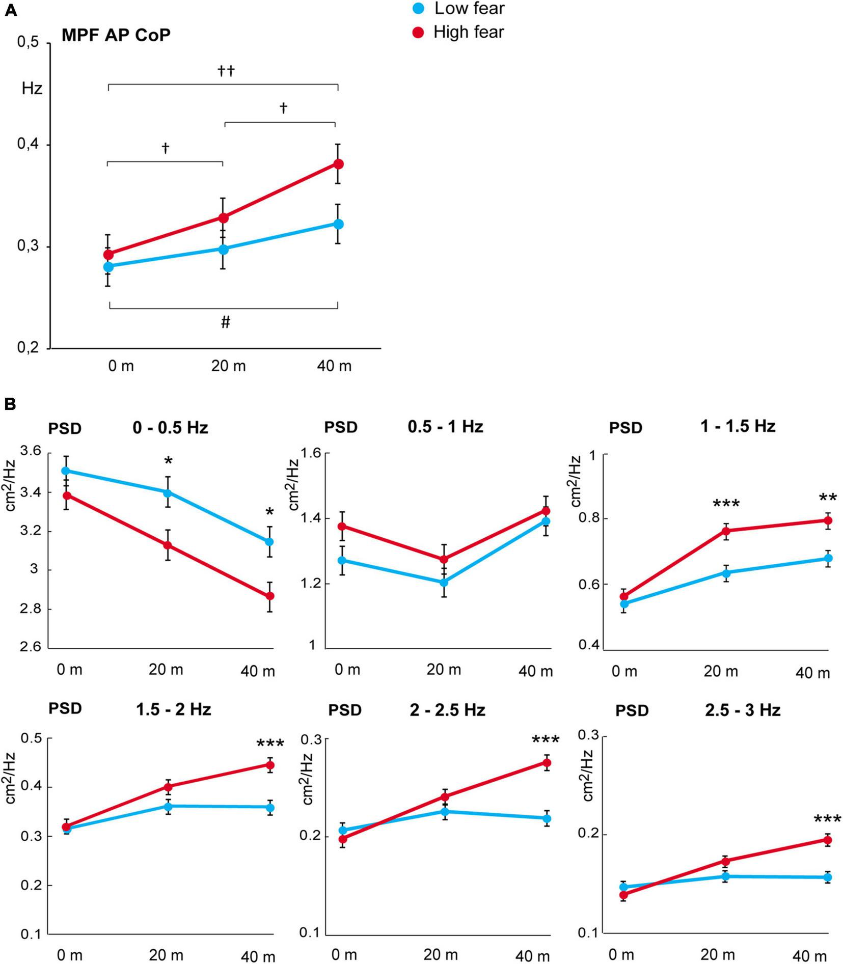 (A) Mean power frequency score of CoP displacement in anterior–posterior direction (estimated marginal means ± SEM). Significant differences between heights 0 versus 20 m, 0 versus 40 m, and 20 versus 40 m are marked as follows: #p < 0.05 for the low fear group and †p < 0.05, ††p < 0.01 for the high fear group. (B) Power spectral density of CoP displacement in anterior–posterior direction (estimated marginal means ± SEM) in six frequency bands at virtual heights of 0, 20, and 40 m in the low and high fear groups. Significant differences between groups are marked as follows: *p < 0.05, **p < 0.01, ***p < 0.001.