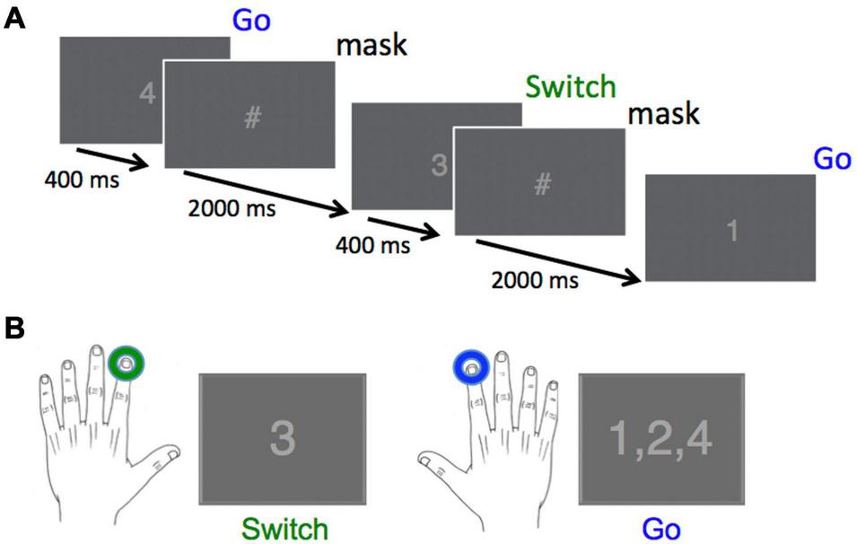Task design and required responses. (A) Digits were presented every 2,400 ms for a duration of 400 ms, followed by a stimulus mask (“#”) for a duration of 2,000 ms. Overall probability for each of the four stimuli was 25%. (B) The correct response to the Switch stimulus (“3”) was a left index finger button press, whereas the correct response to all other stimuli was a right index finger button press (Reprinted with permission from Isabella et al., 2019).
