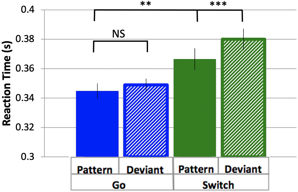 Reaction time. Mean RTs and standard errors for response types Pattern and Deviant Go, Pattern and Deviant Switch. Pattern Go, Pattern Switch and Deviant Switch response types were all significantly different from each other (all p < 0.003), but not Pattern and Deviant Go (p = 0.30). **p < 0.01, ***p < 0.001 for post-hoc t-tests of PGo vs PSw, and PSw vs DSw.