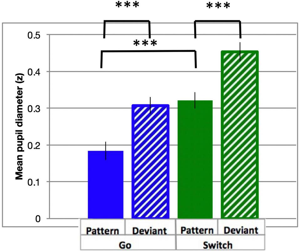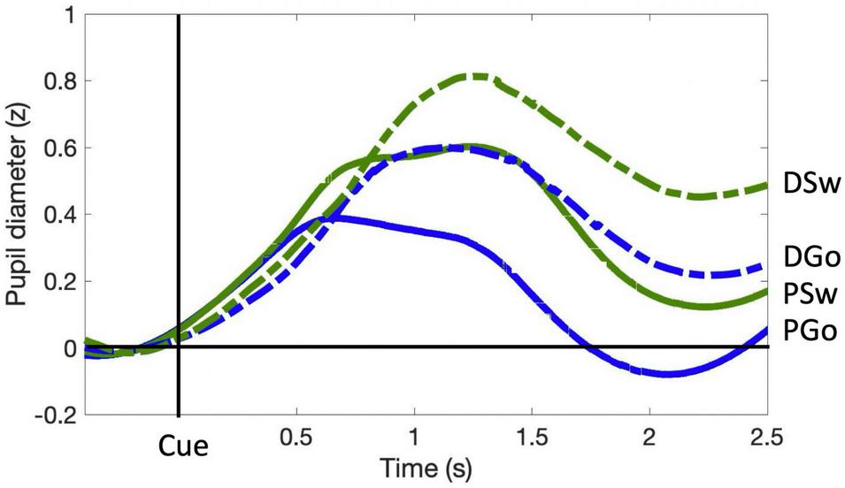 Pupil dilation is a well-established covert measure of quantifying cognitive control (Kahneman and Beatty, 1966). In the current study, similar to RT, all analysis of Pattern trials contained data from blocks 2–6 only, excluding the first block during which the pattern was learned. PD followed a typical time course, beginning at a minimum prior to stimulus onset, and dilating to a maximum diameter within 0.5 to 1.5 s (Figure 3). Diameters generally returned to approximately pre-stimulus levels following PGo trials ahead of the next trial at 2.4 s (n.b. all trials included in the analysis were preceded by PGo trials). PD was calculated as the mean baselined z-scored pupil diameter for 2 s following stimulus onset (time 0 to 2 s), and was smallest for PGo trials, and increased for each of DGo, PSw and DSw trials (mean PGo = 0.25 ± 0.04 z, DGo = 0.44 ± 0.03 z, PSw = 0.46 ± 0.03 z, DSw = 0.56 ± 0.03 z; Figure 4). In order to determine the effects of the task parameters on PD, a 2-way ANOVA was conducted, revealing a statistical main effect of Switch [F(1,15) = 176.2, p < 0.001, ηp2 = 0.92] and of pattern [F(1,15) = 76.64, p < 0.001, ηp2 = 0.84], and no interaction between the two (F(1,15) = 3.46, p = 0.08). Post-hoc comparisons revealed significant differences between PGo and PSw, PGo and DGo, and Pattern and Deviant Sw (all p < 0.001). These results reveal a parametric increase in PD with decreasing stimulus probability, and contrasted with RT results, consistent with previous findings that PD and RT index different processes within cognitive control (Isabella et al., 2019).