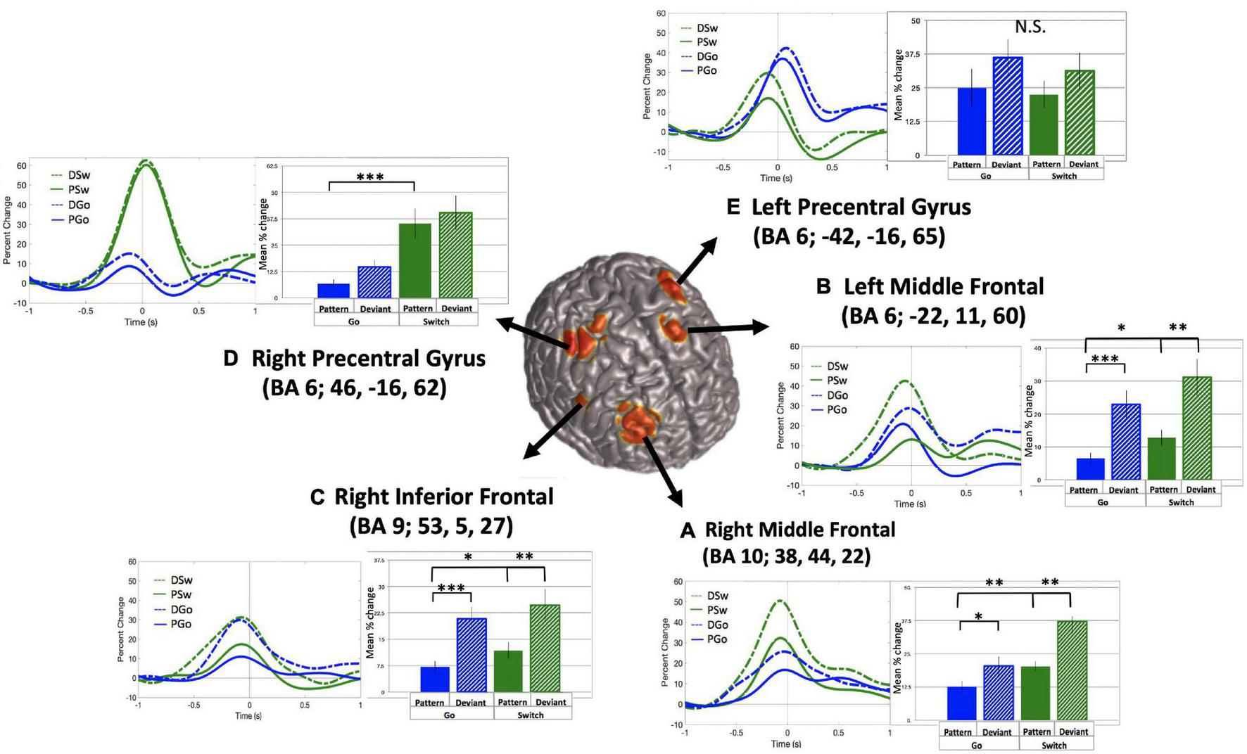Importantly, all trial types as defined were preceded by a Pattern Go response. Any missed (nonresponse within 1.5 s of stimulus presentation) trials were rare and not included in any analyses. All trials following a “3” stimulus were not included in the analysis, as subjects quickly learned that the Switch stimulus “3” never occurred twice in succession and therefore could explicitly predict that a Go trial would follow a Switch trial. Any trials containing the incorrect response were also not included in the analysis. Therefore, all trials included in the analysis were preceded by a correct Go response. Furthermore, as differences were observed between pattern and deviant trials from the first block, blocks 2–6 were included for analysis for Pattern trials (i.e., upon learning the pattern), and blocks 1–6 for Deviant trials.