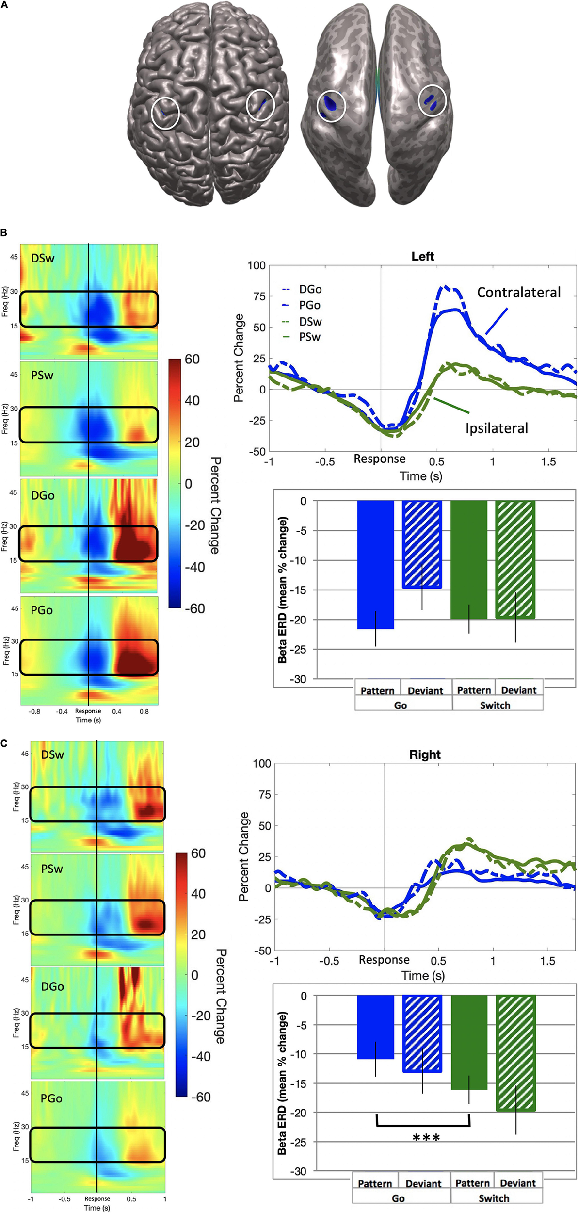 Beta event-related desynchronisation. (A) Source localization in left (x = –38, y = –21, z = 43; BA 3) and right (x = 38, y = –21, z = 40; BA 3) motor cortex, also shown on an inflated brain (right), with baseline set to –0.7 to –0.4 s relative to response onset. (B) Left motor cortex. (Left panel) Time-frequency representations for all trial types, with the frequency bin of interest (15–30 Hz) outlined in black. (Top panel) Time courses for beta ERD in the left motor cortex, for all trial types. (Bottom panel) Mean beta ERD (in percent change over baseline) and standard errors over 150 ms preceding response onset for all trial types. No significant differences were found. (C) Right motor cortex. (Left panel) Time-frequency representations for all trial types, with the frequency bin of interest (15–30 Hz) outlined in black. (Top panel) Time courses for beta ERD in the left motor cortex, for all trial types. (Bottom panel) Mean beta ERD (in percent change over baseline) and standard errors over 150 ms preceding response onset for all trial types. Post-hoc analysis revealed a significant increase for Pattern Switch trials over Pattern Go trials (p < 0.001), but not Deviant Go trials (p = 0.49). ***p < 0.001 for post-hoc t-tests of PGo vs PSw.