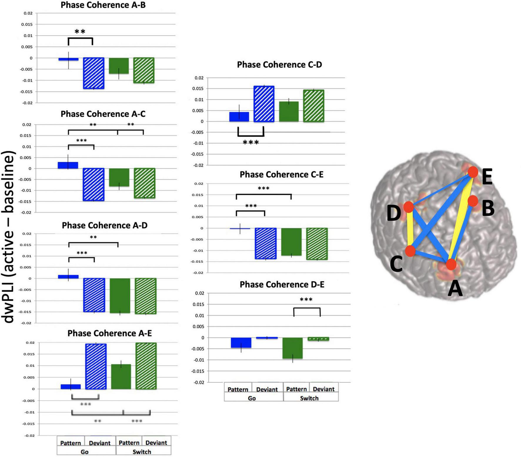 For each comparison where dwPLI exceeded the statistical threshold, the active window with the greatest increase over baseline in dwPLI was selected for analysis of task effects using a 2-by-2 within-subject repeated measures ANOVAs were conducted (factors were Switch and pattern), as above. P-values were Holm-adjusted for the number of comparisons (5 theta sources resulted in 10 comparisons between each source). Thus, the null hypothesis was rejected for ANOVAs only if the p-value of the test was less than rank-order significance level.