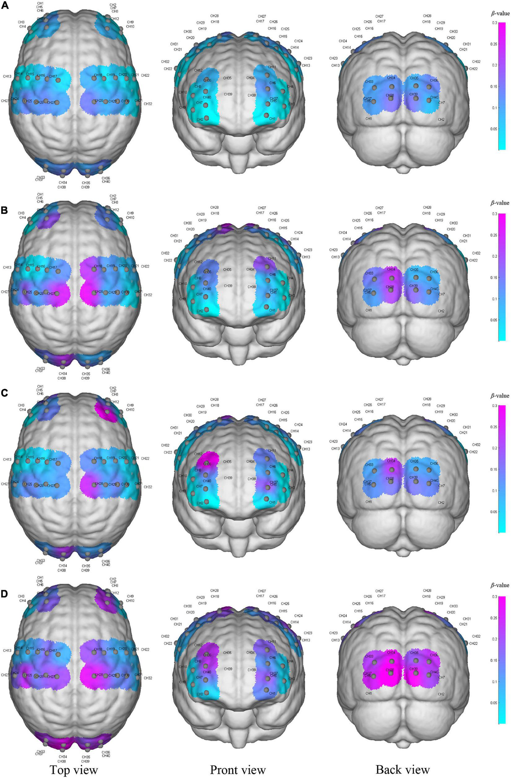 The activation of the cerebral cortex during resting state (A), initial stage (B), intermediate stage (C) and sprint stage (D) under three viewing angles (top view, front view, and back view). The color reflects the mean β-value of each region on the time scale, and the purple color represents higher activation than the blue–colored regions. Gray node represents the channel formed by each light source probe and detector probe, and the CH number is the label of the channel.