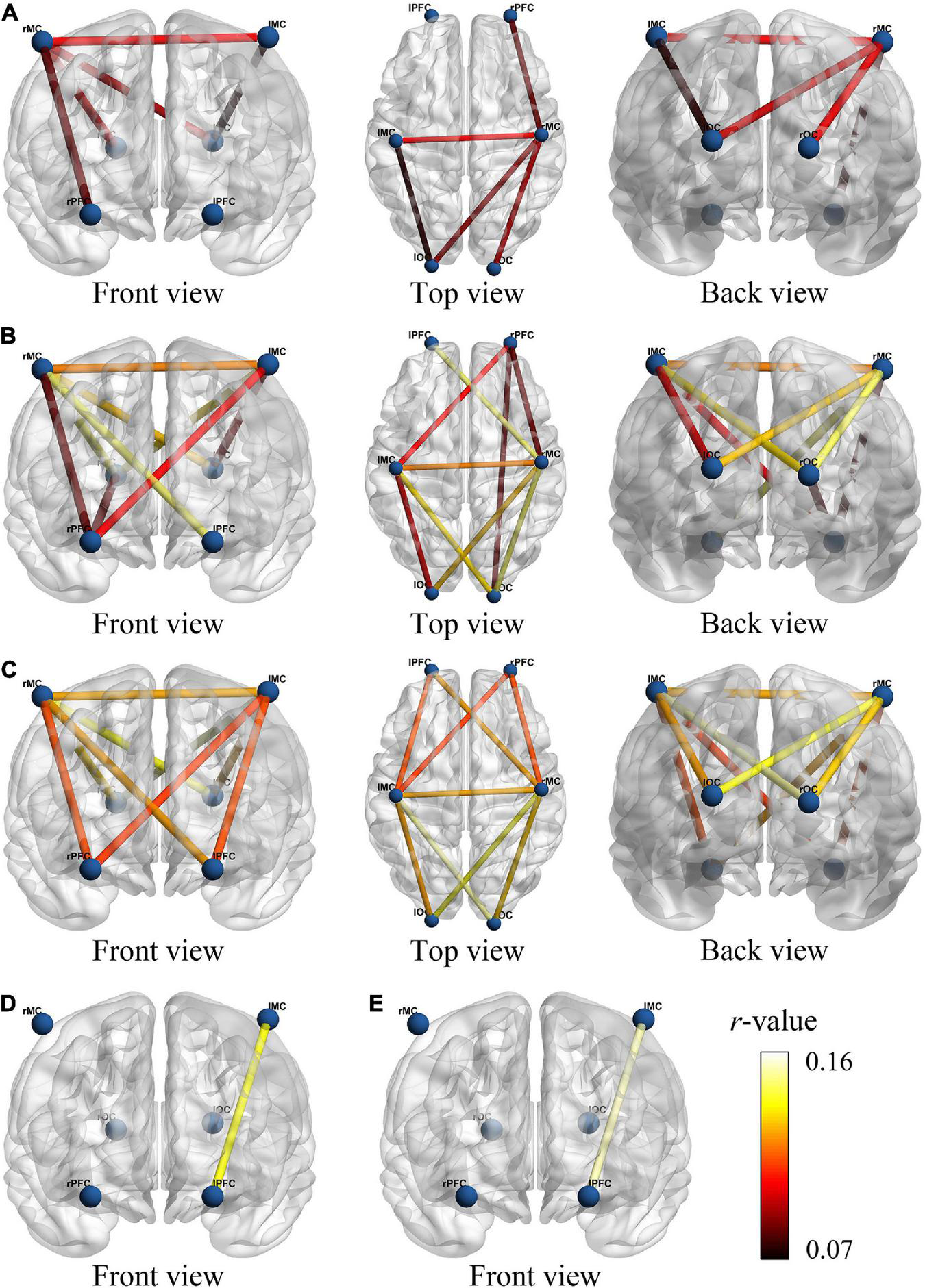 The functional connectivity visual map under different viewing angles. The connectivity line indicates the significant changes of r-value between resting and initial stage (A), resting and intermediate stage (B), resting and sprint stage (C), initial and intermediate stage (D), initial and sprint stage (E). The blue nodes represent six brain regions. Line color indicates the connectivity intensity, and the brighter color represents higher strength.