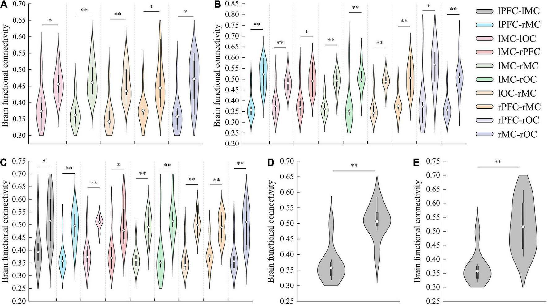 The results of significant changes of FC value between resting and initial stage (A), resting and intermediate stage (B), resting and sprint stage (C), initial and intermediate stage (D), initial and sprint stage (E). *p < 0.05, **p < 0.01.