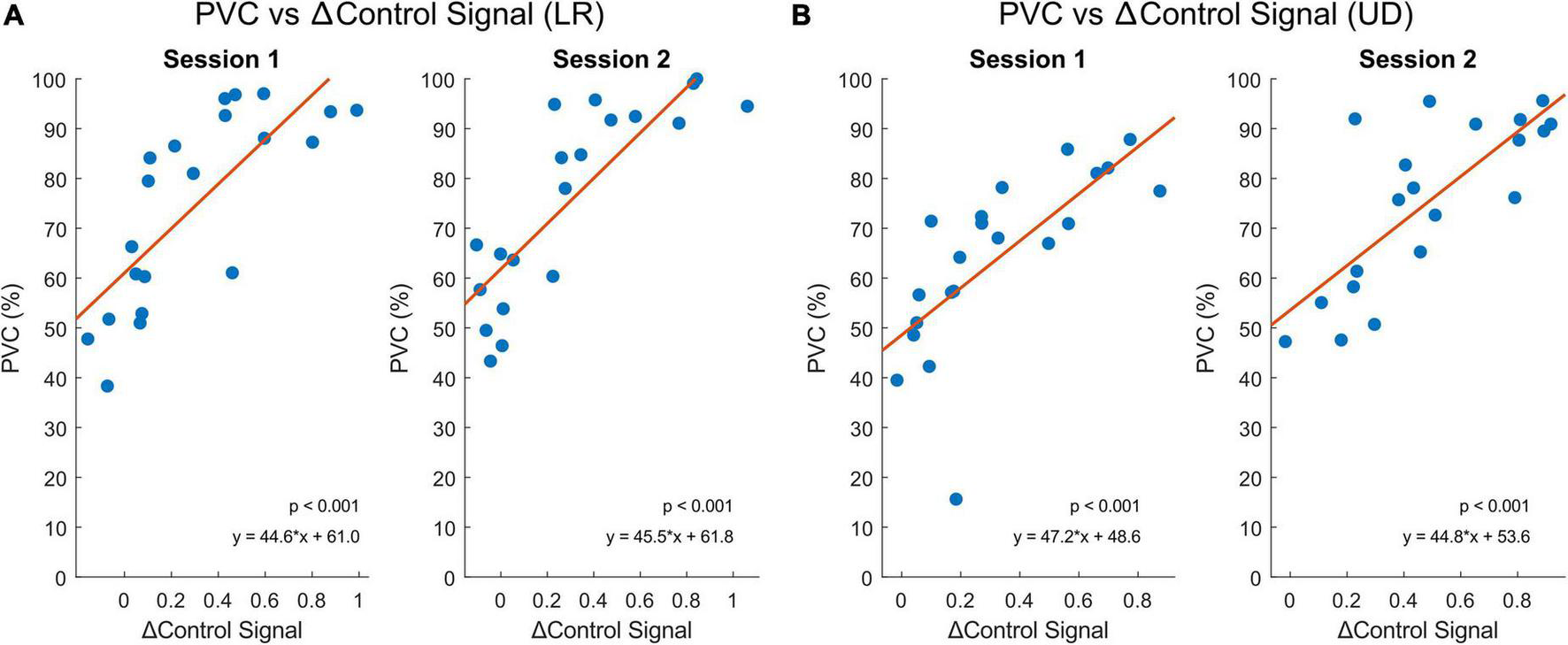The relationship between △control signal and BCI performance (PVC, %) from both sessions using Spearman’s correlation. Session 1 contains subjects from group MC (n = 10) and group CM (n = 11) and session 2 contains subjects from group MM (n = 10) and group MC (n = 10). Blue dots represent each subject and orange lines represent the linear regression models of the individual points. (A) BCI performance correlates significantly with the △control signal between the left and right trials (p < 0.001). (B) BCI performance correlates significantly with the △control signal between the up and down trials (p < 0.001).