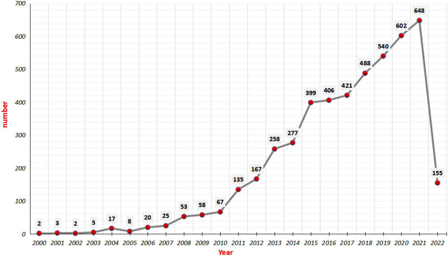 The number of publications related to transcranial direct current stimulation (tDCS) extracted from the web of science core collection (WOSCC), 2000–2022.
