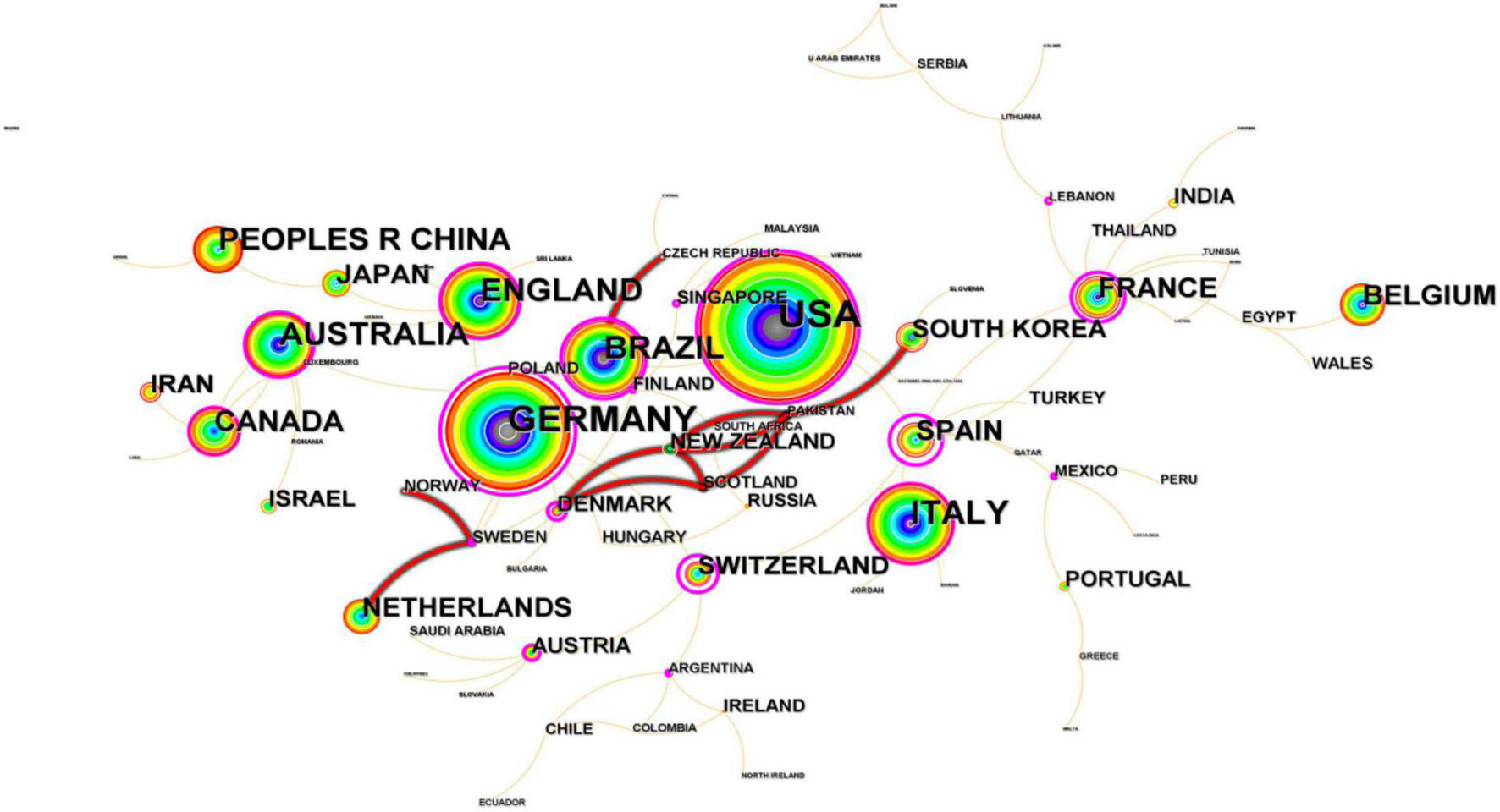 A map of some countries’ cooperative relations in research of transcranial direct current stimulation (tDCS), 2000–2022.