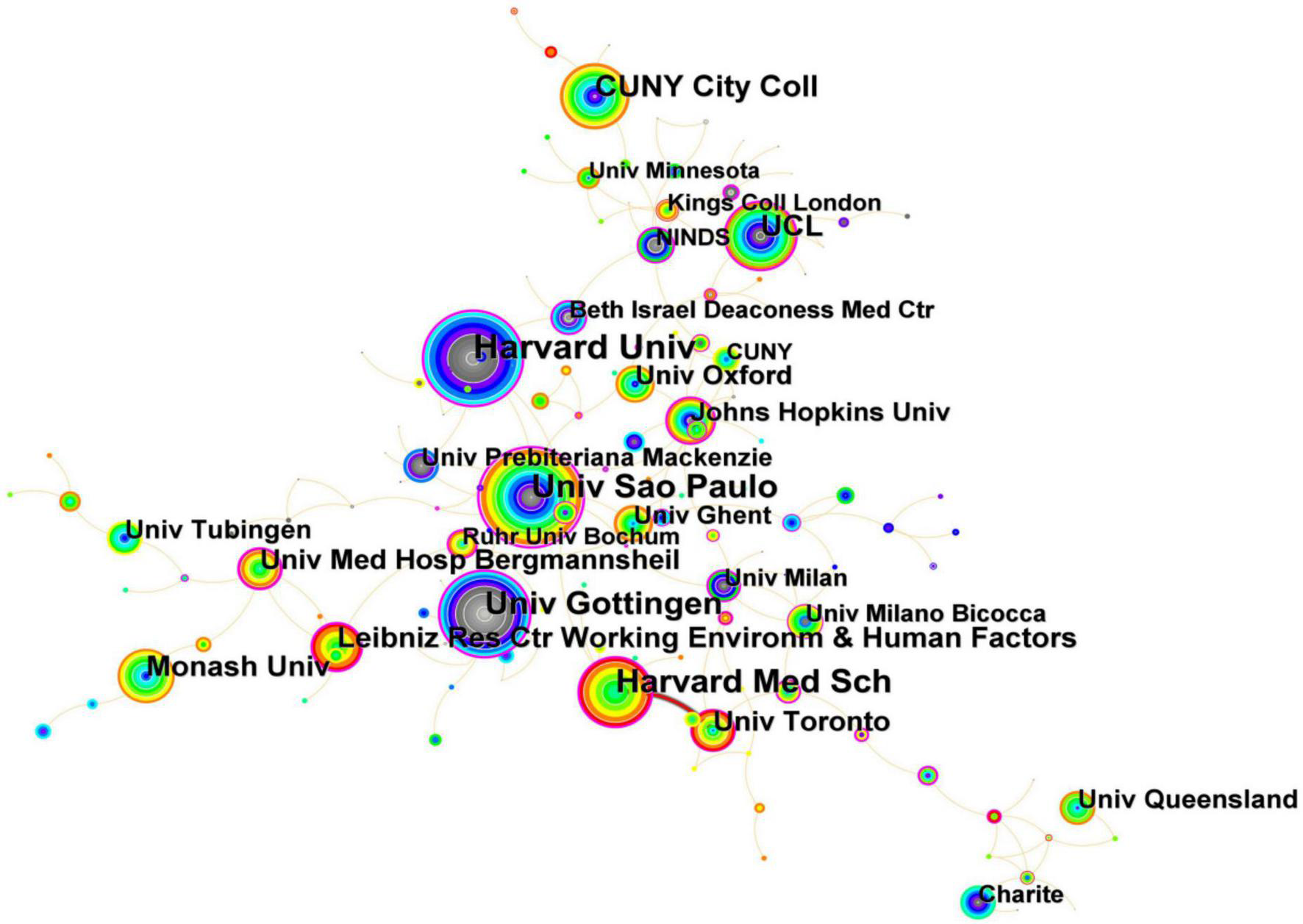 Map of top institutional relations related to transcranial direct current stimulation (tDCS), 2000–2022.