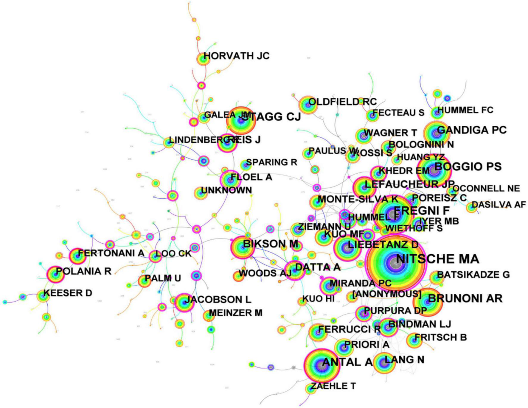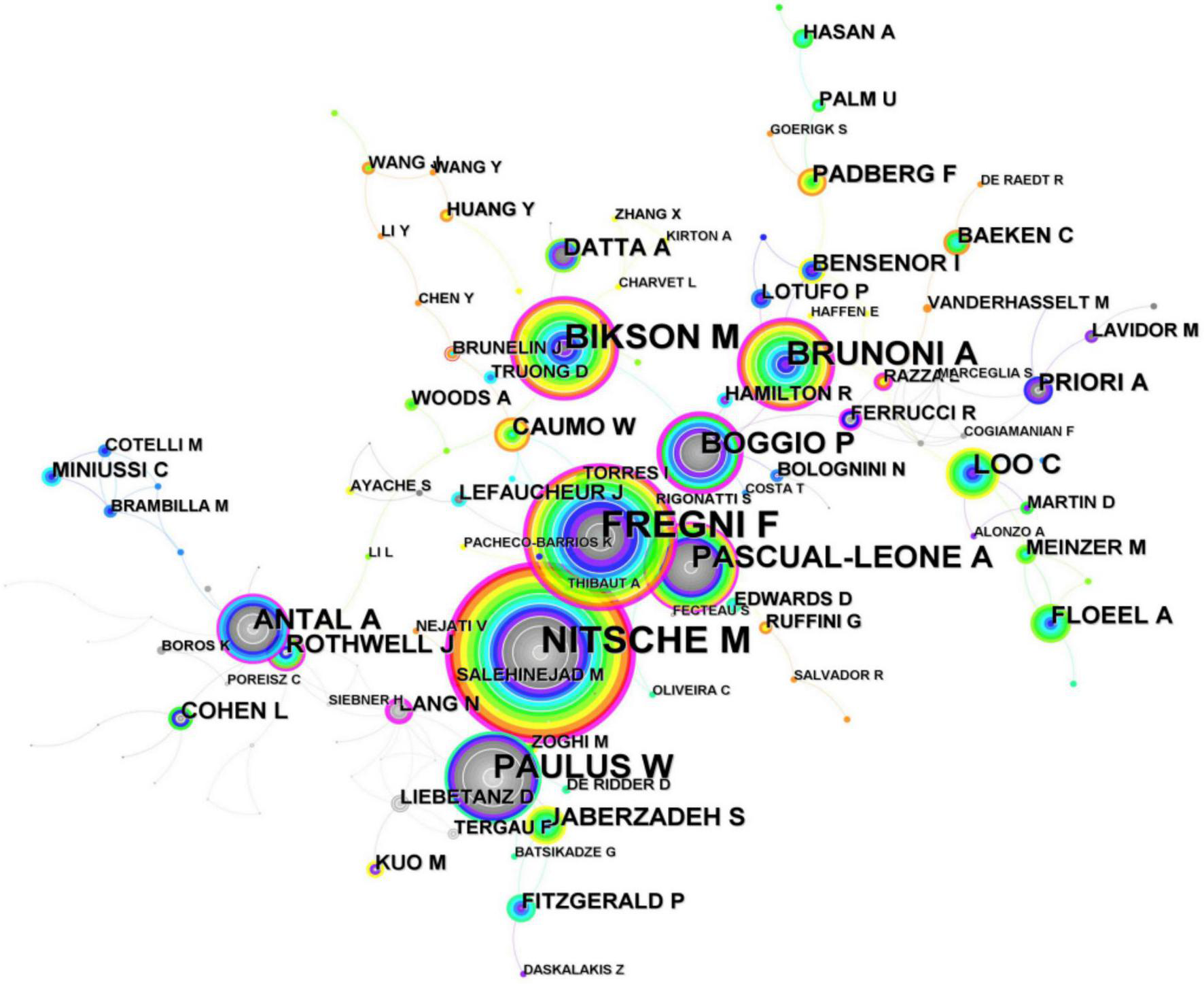 Hitherto, more than 189 scholars participated in research relevant to tDCS and accomplished more than 4,756 publications. The researchers’ effort and contribution to a certain field may be represented by the number of scientific publications written by them (Wu et al., 2021a). From Table 2, we learned that the top 10 authors contributed 999 papers (21.01%) to research on tDCS. From the perspective of publication count, the most prolific author was NITSCHE MA (206 publications) from University of Gottingen, and an article titled “Transcranial direct current stimulation: State of the art 2008” published by him along with other authors in 2008 whose cited frequency ranked second (1,891 times) gained much attention in the field of tDCS (Table 4). The next highest was FREGNI F (202 publications) from Harvard Medical School. Their study provided guidance on how to perform tDCS safely and effectively, and stimulus packages were stratified to improve the comparability of new findings (Nitsche et al., 2008). BIKSON M (125 publications) from City College of New York (CUNY) ranked third, while he collaborated with NITSCHE MA and FREGNI F several times and published some articles together.